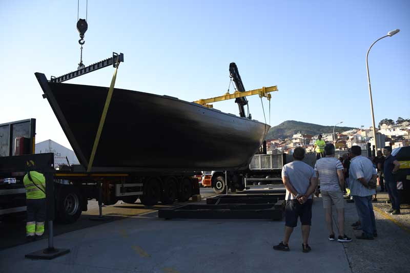 E mentres isto acontecía no mar, na Guarda veciños e visitantes seguían con expectación o percorrido do volanteiro construído por Piueiro dende o estaleiro O Pasaxe ata o porto guardés. No traslado investíronse nove horas e foi necesario un dispositivo de máis de 20 persoas, tres guindastres, un tráiler, dous elevadores e a colaboración do Concello para conseguir que esta embarcación tradicional, que se cría perdida, volvese á vida da man da asociación guardesa, en colaboración con numerosas empresas e particulares que coas súas achegas contribuíron a esta construción.