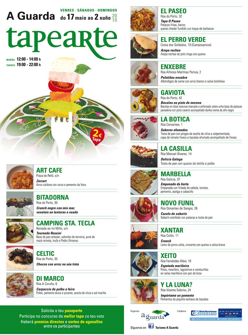 Nesta edición participan o Art Café coa tapa «Xorzart», o Bitadorna coa tapa «Crunch negro con mix mar, vexetais en texturas e xeado», o Camping Santa Tecla coa tapa «Tournedo Rossini», o Celtic coa tapa «Chocos con arroz na súa tinta», a Pizzería Di Marco coa tapa «Carpaccio de polbo á feira», a Tapería El Paseo coa tapa «O Paseo», El Perro Verde coa tapa «Arepa rechea», o Enxebre coa tapa «Pelotiñas enxebre», o Gaviota coa tapa «Bacalao ao pisto de morena», La Botica coa tapa «Sabores afumados», La Casilla coa tapa «Delicia Galega», Marbella coa tapa «Empanada da horta», Novo Funil coa tapa «Cazola de Xabarín», Xantar coa tapa «Crunk», Xeito coa tapa «Espetada mariñeira» e Y la Luna? coa tapa «Impórtame un pemento».