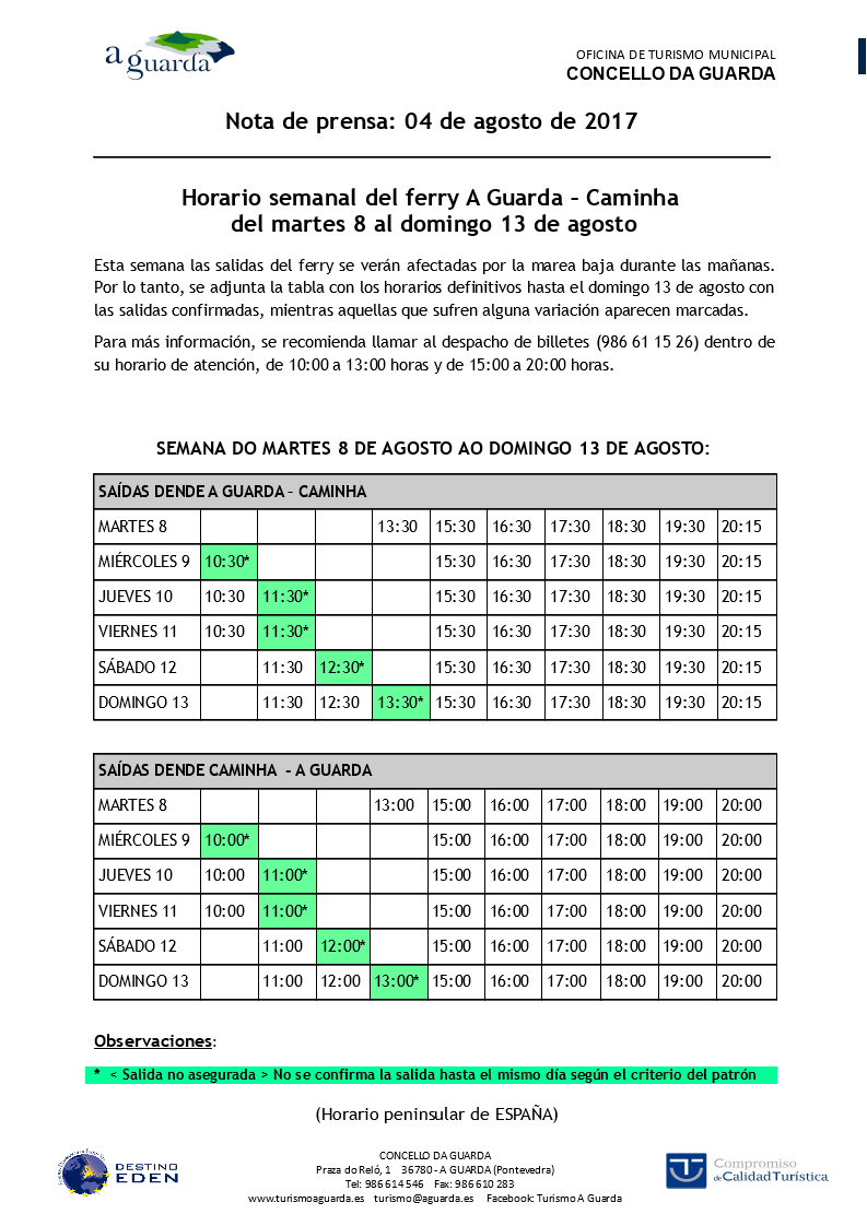 Esta semana as saídas do ferry veranse afectadas pola marea baixa durante as mañás. Por iso, adxúntase a táboa cos horarios definitivos ata o domingo 13 de agosto coas saídas confirmadas, mentres que aquelas que sofren algunha variación aparecen marcadas. Para máis información, recoméndase chamar ao despacho de billetes Ler máis