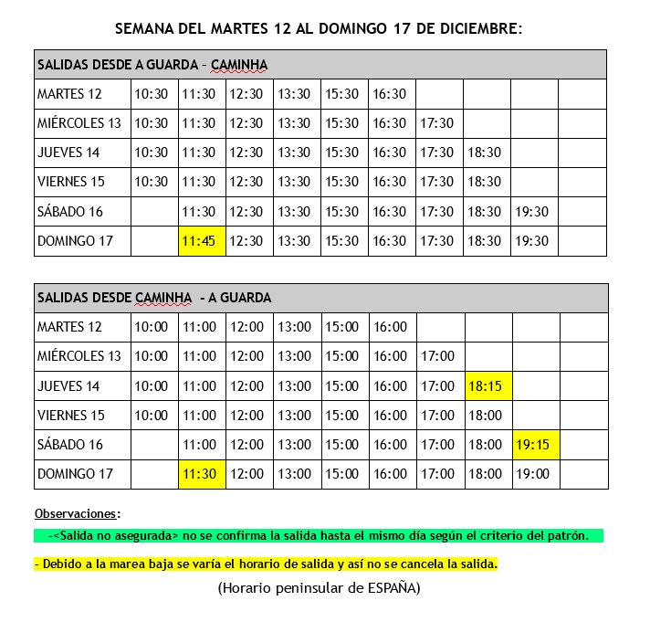 Esta semana as saídas do ferry poderán verse afectadas pola marea baixa. Por iso, adxúntase a táboa cos horarios definitivos ata o domingo 17 de decembro coas saídas confirmadas e aquelas que sofren algunha variación están marcadas.