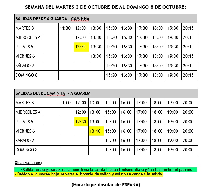 Esta semana as saídas do ferry veranse afectadas pola marea baixa. Polo tanto, achegamos a táboa cos horarios definitivos ata o domingo 8 de outubro coas saídas confirmadas e aquelas que sofren algunha variación están marcadas.