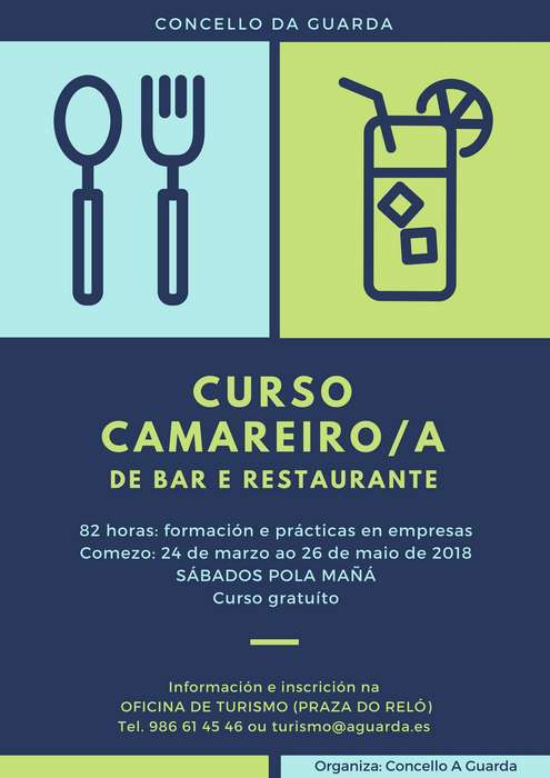 A Concellaría de Turismo ofrece un curso gratuíto para a formación de camareiros/as de bares e restaurantes, que se desenvolverá entre o 24 de marzo e o 26 de maio. O obxectivo principal é formar a novas camareiras/os na preparación e presentación de bebidas e alimentos propios dun bar ou restaurante, aplicando as normas básicas de manipulación de alimentos e atención ao cliente. Ao rematar, o alumnado tamén recibirá o diploma de manipulador/a de alimentos.