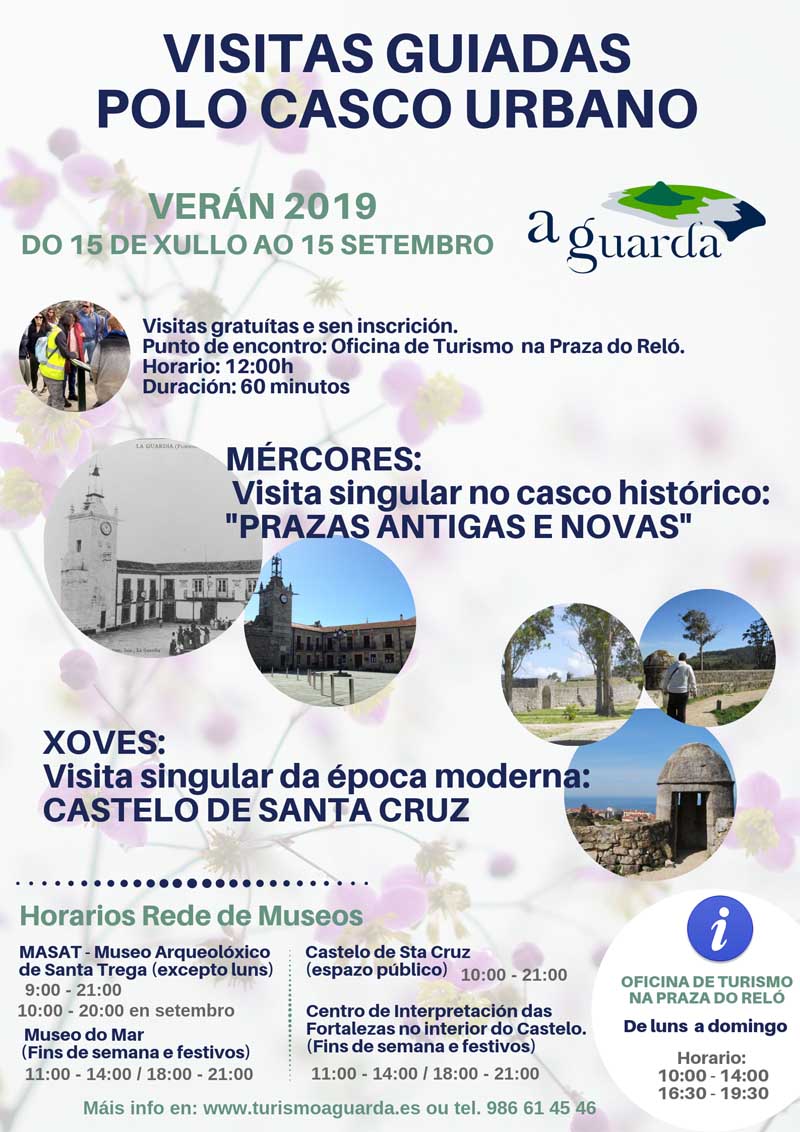 O Concello da Guarda, a través da Concellaría de Turismo, iniciou un programa de visitas guiadas polo casco urbano que se realizan os mércores e xoves ata o 15 de setembro. As visitas son de carácter gratuíto e non é necesaria inscrición previa, tan só acudir ás 12:00h ao punto Ler máis